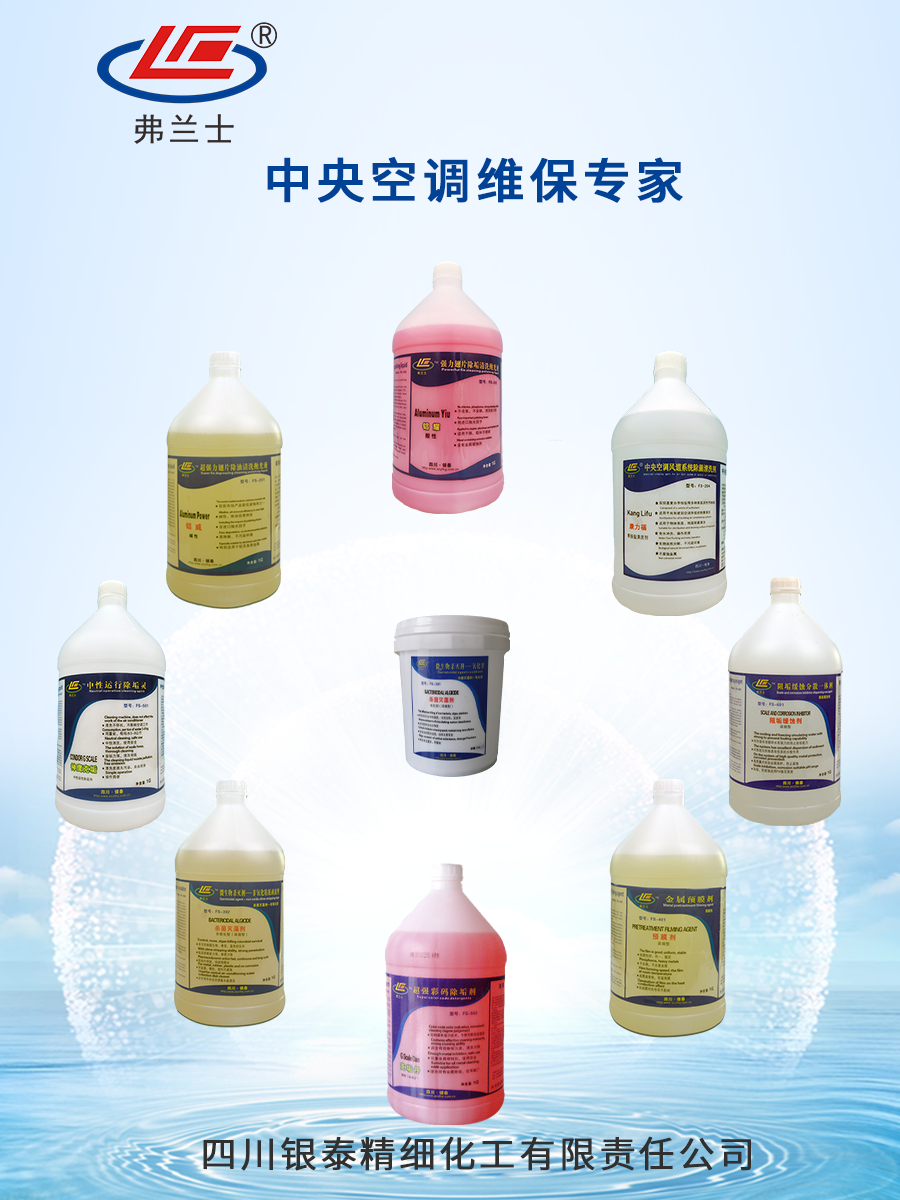 弗蘭士FS501中性運(yùn)行除垢靈(神鷹克垢)/運(yùn)行除垢劑/不停機(jī)清洗劑本機(jī)清洗時(shí)清洗不停機(jī),不影響空調(diào)系統(tǒng)工作。用量?。好繃嵥?-8kg,中性清洗,使用安全,溶垢力強(qiáng),清洗徹底,清洗廢液無污染,自由排放。